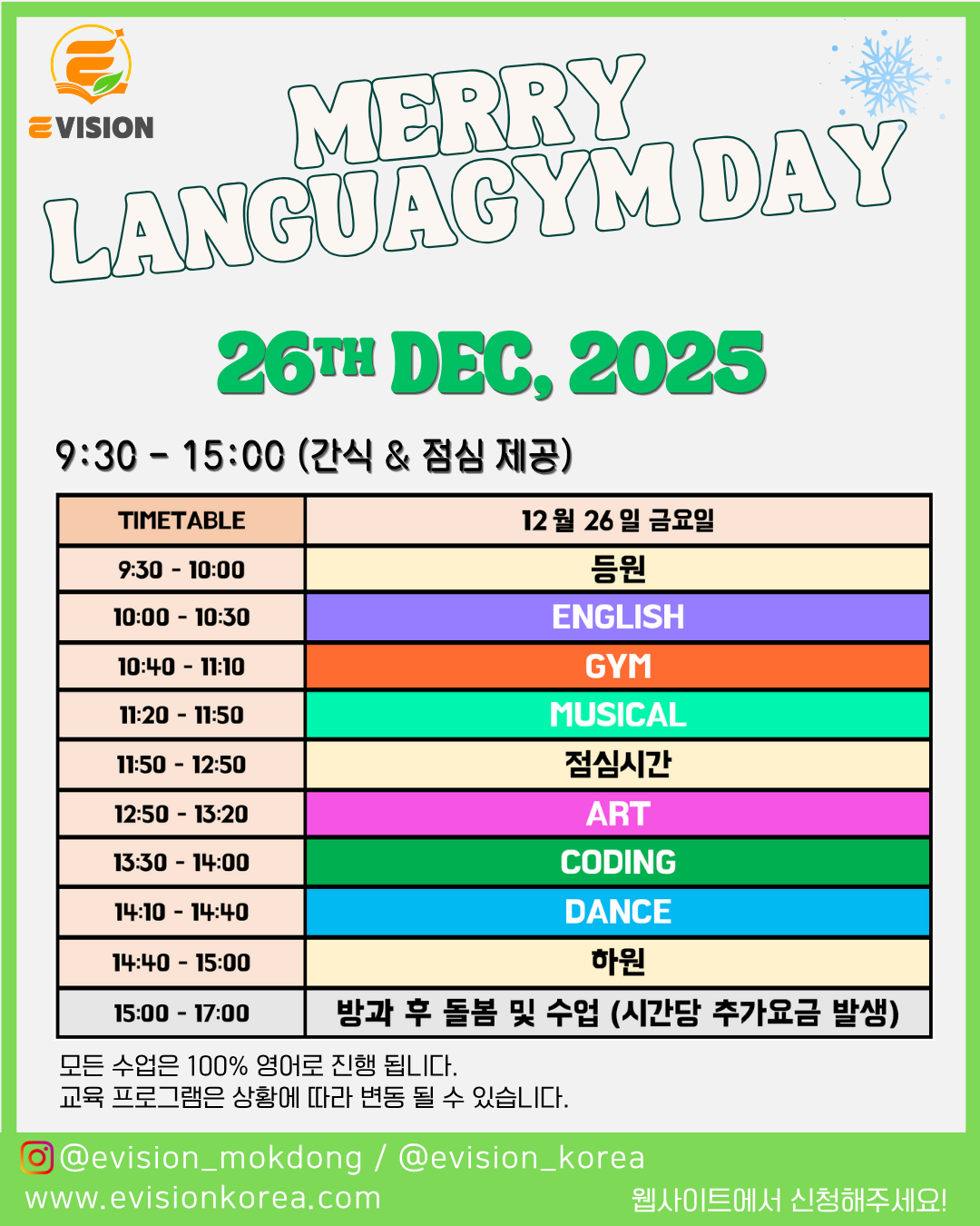 🎄✨ 이비전캠프 프롤로그: MERRY LANGUAGYM DAY ✨🎄이비전 겨울캠프 팀(이비전 강사 + 원어민 선생님)과 원데이 영어 체험!👶🏻 FOR WHOM?:• 신나는 영어캠프 하루 먼저 더 참여를 원하는 아이!• 영어캠프 기간동안 시간이 안되거나 가격이 부담 됬던 아이!• 영어로 즐거운 하루를 보내고 싶은 아이!🗓 12/26(금) | ⏰ 09:30–15:00 (간식·점심 포함)➕ 방과후 돌봄 15:00–17:00(선택, 시간당 15,000원)📍 젤리어학원 목동캠퍼스(양천구 목동서로 285, 황금프라자 3F)🎯 2017–2021년생 / 연령별 소그룹(클래스당 최대 12명)💸 이비전 겨울캠프 참여인원: 9만원(할인가)(*일반 등록가는 포스터 참고)📌 프로그램 하이라이트ENGLISH · GYM · MUSICAL · ART · CODING · DANCE— 100% 영어 몰입, 하루 종일 안전 돌봄까지!🖱 신청 & 안내👉 프로필 링크 확인! 이비전 목동센터 웹사이트 -> 원데이 신청서📞 문의: 010-4885-0596📸 더 많은 정보는 포스터 슬라이드 확인!